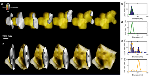 圖4 (a)和(b)電極顆粒在電化學(xué)循環(huán)前后的三維形貌圖;(c)和(d)循環(huán)前材料顆粒中內(nèi)部微孔孔徑分布統(tǒng)計;(e)和(f)循環(huán)后材料顆粒中內(nèi)部微孔孔徑分布統(tǒng)計。