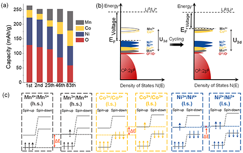 圖3 Li1.2Ni0.15Co0.1Mn0.55O2不同充放電周次的氧化還原反應(yīng)(a)不同元素在不同充放電周次對容量的貢獻(xiàn);(b)電子結(jié)構(gòu)變化帶來的鋰離子儲存電勢的變化;(c)不同過渡金屬氧化還原電對能級差異與電壓衰減關(guān)聯(lián)。