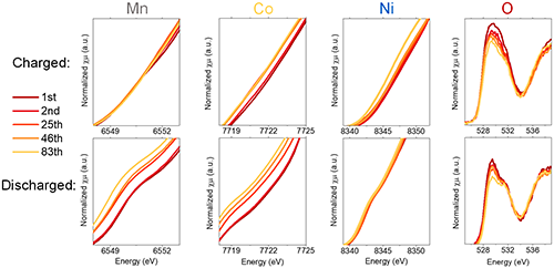 圖2 Li1.2Ni0.15Co0.1Mn0.55O2中不同元素在不同充放電周次的X射線吸收光譜。