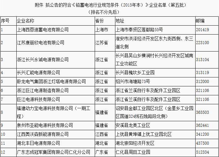 中國儲能網(wǎng)訊:據(jù)工信部網(wǎng)站今日消息,為推動(dòng)鉛蓄電池行業(yè)可持續(xù)發(fā)展,依據(jù)《鉛蓄電池行業(yè)規(guī)范條件(2015年本)》(以下簡稱《規(guī)范條件》),工信部組織專家組開展了鉛蓄電池企業(yè)規(guī)范審核工作?,F(xiàn)公示擬公告的符合《規(guī)范條件》企業(yè)名單(第五批),公示期10個(gè)工作日。