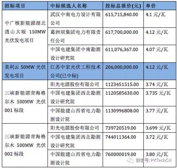 中國儲(chǔ)能網(wǎng)訊:不久前,三峽新能源公示青海省格爾木500MW和陜西渭南100MW光伏發(fā)電應(yīng)用領(lǐng)跑者項(xiàng)目EPC總承包中標(biāo)候選人,陽光電源分別以約為3.745元/瓦、3.699元/瓦、4.847元/瓦的單瓦報(bào)價(jià)位列兩個(gè)招標(biāo)共三個(gè)標(biāo)段的第一候選人。
