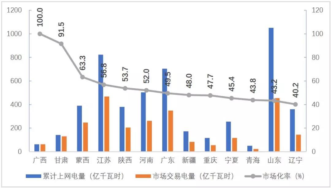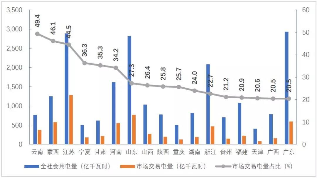 分省來看,市場交易電量占全社會用電量比重排序前三名的省份是云南、蒙西和江蘇,分別為49.4%、46.1%、44.5%;電力市場交易電量規(guī)模排序前三名的省份分別為江蘇1286億千瓦時、山東768億千瓦時、廣東599億千瓦時;外受電市場交易電量排序前三名的省份分別是江蘇286億千瓦時、山東242億千瓦時和浙江160億千瓦時。