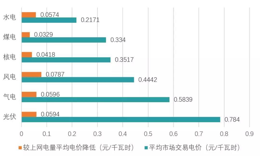 圖8 上半年大型發(fā)電集團(tuán)各類電源平均市場交易電價和較上網(wǎng)電量平均電價降低價格