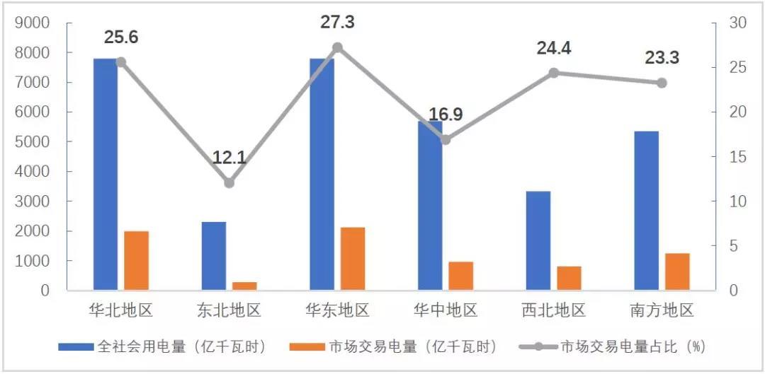 分區(qū)域市場來看,華東、華北、南方區(qū)域市場交易電量規(guī)模分別為2124億千瓦時、1996億千瓦時、1246億千瓦時,占全國市場交易電量的比重分別為28.2%、26.5%、16.6%,合計占全國市場交易電量比重的70%以上,對全國電力市場建設(shè)具有引領(lǐng)作用。