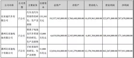 公告還顯示,比亞迪主要子公司及對公司凈利潤影響達10%以上的參股公司情況(見下圖,單位:元),其中惠州比亞迪電池有限公司實現(xiàn)營業(yè)收入64.81億元,凈利潤1.71億元。