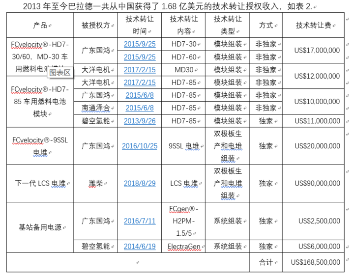 2013年至今巴拉德一共從中國獲得了1.68億美元的技術(shù)轉(zhuǎn)讓授權(quán)收入,如表2.