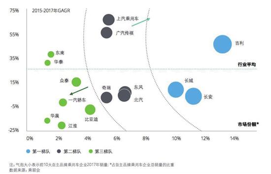 中國儲能網(wǎng)訊:如果把中國汽車品牌(乘用車)分成幾個梯隊,那么從規(guī)模量級看,已經(jīng)跨過100萬輛門檻的吉利汽車、長城汽車和長安汽車屬于“第一軍團”;年銷介于50萬輛到100萬輛之間的上汽集團、廣汽集團、奇瑞汽車、北汽集團和東風(fēng)汽車處在“第二陣營”;低于50萬輛的眾泰汽車、東南汽車、一汽轎車、江淮汽車、華晨、比亞迪等“第三梯隊”,則面臨前所未有的巨大壓力。