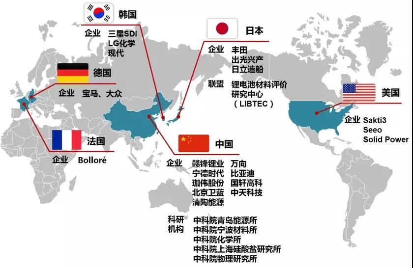 由于當前磷酸鐵鋰和三元鋰電池自身的瓶頸,以及固態(tài)電池的潛在優(yōu)勢,歐美、日韓、中國等國家的涉及動力電池、汽車及能源方面的產(chǎn)業(yè)鏈上眾多企業(yè)正在積極布局和研發(fā)固態(tài)電池。