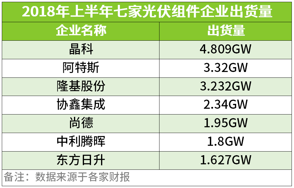 2018年上半年七家光伏組件企業(yè)出貨量統(tǒng)計(jì):