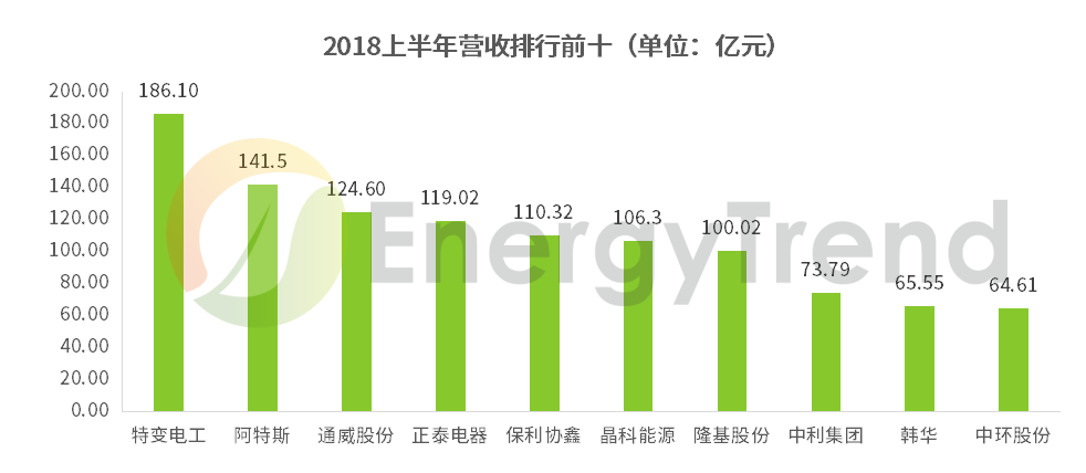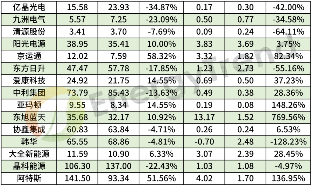總體來(lái)看,有將近七成的企業(yè)營(yíng)業(yè)額實(shí)現(xiàn)增長(zhǎng),特變電工、阿特斯、通威、正泰、保利協(xié)鑫、晶科、隆基營(yíng)收均破百億,分別達(dá)到186.1億元、141.5億元、124.6億元、119.02億元、110.32、106.3億元、100.02億元。除此之外,中環(huán)、隆基、阿特斯等企業(yè)營(yíng)收增幅超50%。