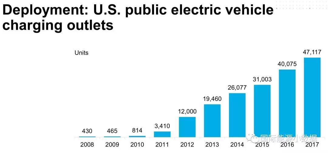2017年美國(guó)共有47,117個(gè)為電動(dòng)車(chē)服務(wù)的公共充電樁,比2016年(40,075)增長(zhǎng)17.6%,其中有6270快速充電樁(占充電樁總數(shù)的13%)。