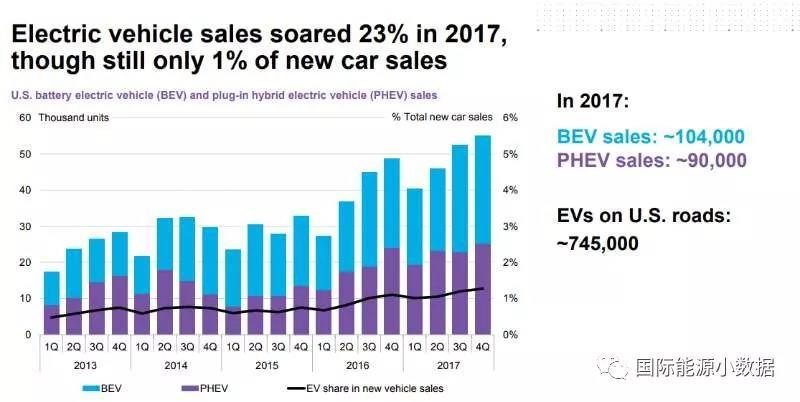 2017年美國(guó)共銷(xiāo)售19.4萬(wàn)輛電動(dòng)車(chē)(包括9萬(wàn)輛插電混動(dòng)),比2017年增長(zhǎng)13%,但只占同年汽車(chē)市場(chǎng)規(guī)模的1%。到2017年底美國(guó)電動(dòng)車(chē)存量為74.5萬(wàn)輛。