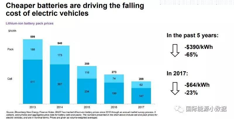 中國(guó)儲(chǔ)能網(wǎng)訊:根據(jù)彭博新能源財(cái)經(jīng)的匯總數(shù)據(jù),2017年美國(guó)電動(dòng)車(chē)用鋰電池組的成本為209美元/千瓦時(shí),比2016年(273美元/千瓦時(shí))下降23%。