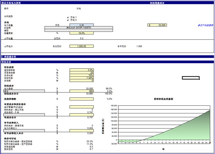 同樣以國內(nèi)目前用戶側(cè)家庭自發(fā)自用光伏發(fā)電為例,以家庭住宅安裝一個(gè)3.3kW的薄膜電池光伏屋頂或幕墻發(fā)電系統(tǒng)。包含電池模組、系統(tǒng)平衡件BOS(除模組以外的系統(tǒng)平衡件:逆變器、電站監(jiān)控系統(tǒng)、組件支架、高低壓配電、變壓器、電纜等)、和土建施工管理費(fèi)用等,系統(tǒng)成本降到約為12元/W左右。假設(shè)貸款比例70%,負(fù)債5年,通貨膨漲率3%,負(fù)債利率按7%,項(xiàng)目壽命25年,年維護(hù)費(fèi)按2%,不考慮碳排放收入,按現(xiàn)行電價(jià)1元/度電回購制度計(jì)算,投資3.3kW小型家庭光伏發(fā)電系統(tǒng),在陽光充足地區(qū),將可得到12%的資產(chǎn)回報(bào)率,7年回收股本,項(xiàng)目經(jīng)濟(jì)性可行(參見下圖)。