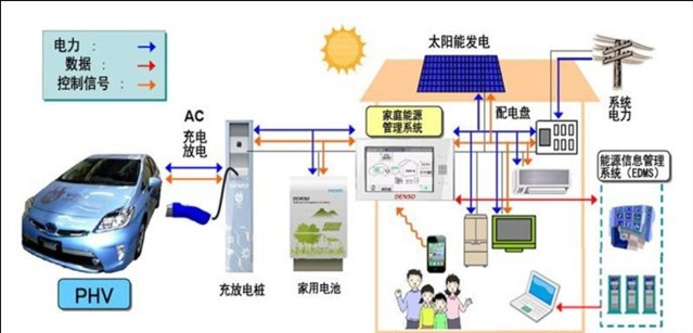 通過插電式混合動(dòng)力車配備的交直流轉(zhuǎn)換器(逆變器),為住宅提供交流電,同時(shí)還可在車輛、充電樁和住宅之間進(jìn)行數(shù)據(jù)通信,利用家庭能源管理系統(tǒng)(HEMS)對(duì)電流進(jìn)行優(yōu)化控制??衫媒ㄖ暗貐^(qū)的光伏發(fā)電設(shè)備所發(fā)的電力及電費(fèi)較低的深夜電力為車輛充電,在用電高峰時(shí)段將儲(chǔ)存的電力移峰用于住宅。