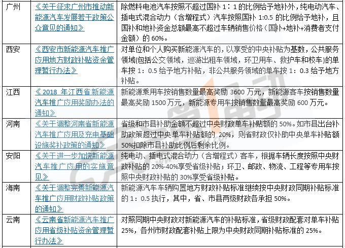 補貼標準方面,廣東、廣州、河南、海南、云南、青海新能源汽車均按中央標準1:0.5補助。上海插電式混動車按中央1:0.3給予補助,純電動和燃料電池車按中央1:0.5補助。西安非公共服務領域的單車按中央1:0.3補貼,公共領域按中央標準1:0.5補助。武漢按新能源汽車軸距大小給予50%和20%補貼。深圳僅出臺了純電動物流車補貼標準。江西、福建莆田和黑龍江出臺了新能源汽車獎勵政策。