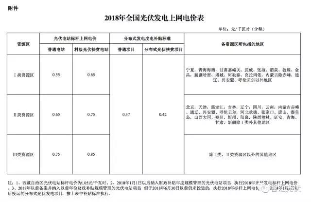 為落實國務院辦公廳《能源發(fā)展戰(zhàn)略行動計劃(2014-2020)》關于新能源標桿上網(wǎng)電價逐步退坡的要求,合理引導新能源投資,促進光伏發(fā)電產(chǎn)業(yè)健康有序發(fā)展,決定調(diào)整2018年光伏發(fā)電標桿上網(wǎng)電價政策。經(jīng)商國家能源局,現(xiàn)就有關事項通知如下: