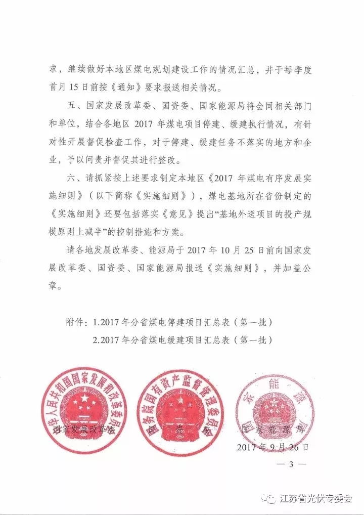 中國儲能網(wǎng)訊:為有力有序有效防范化解煤電產(chǎn)能過剩風(fēng)險,確保完成2017年《政府工作報告》提出的煤電調(diào)控目標(biāo)任務(wù),按照《關(guān)于推進供給側(cè)結(jié)構(gòu)性改革 防范化解煤電產(chǎn)能過剩風(fēng)險的意見》(發(fā)改能源[2017]1404號)等相關(guān)文件要求,9月26日,國家發(fā)展和改革委員會、國務(wù)院國有資產(chǎn)監(jiān)督管理委員會、國家能源局聯(lián)合印發(fā)《2017年分省煤電停建和緩建項目名單的通知》,其中: