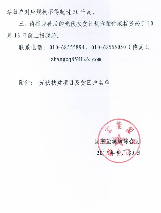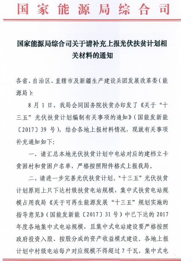 中國儲能網(wǎng)訊:2017年國慶節(jié)最后一個工作日,國家能源局綜合司發(fā)文要求各省、自治區(qū)、直轄市及新疆生產(chǎn)建設(shè)兵團(tuán)的發(fā)改委(能源局)務(wù)必于10月13日完成光伏扶貧計劃相關(guān)材料的補(bǔ)充上報工作。