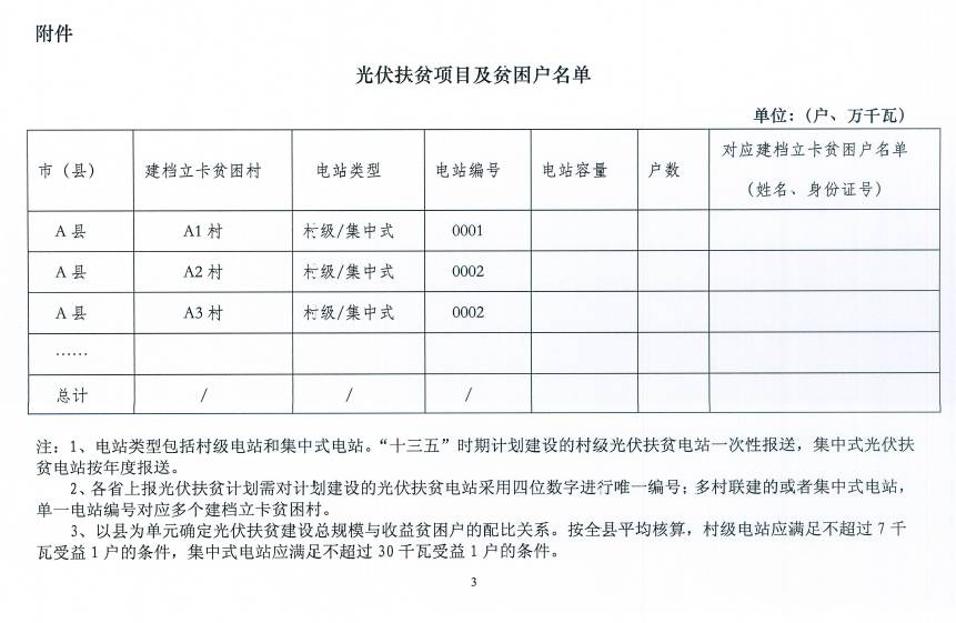在該文件中,國家能源局綜合司強(qiáng)調(diào)光伏扶貧項目對應(yīng)的建檔立卡貧困村和貧困戶名單必須嚴(yán)格按照格式填寫;此外,集中式電站必須按照政府投資入股、按股分成的資產(chǎn)收益模式建設(shè);并且再次強(qiáng)調(diào),村級電站每戶對應(yīng)規(guī)模不應(yīng)超過7千瓦、集中式電站每戶對應(yīng)規(guī)模不應(yīng)超過30千瓦。