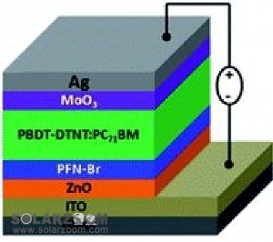 由于在傳統(tǒng)體異質(zhì)結(jié)型聚合物太陽電池采用ITO/PEDOT:PSS/BHJ/Ba(Al)結(jié)構(gòu)中,酸性磺化聚苯(PSS)摻雜的聚噻吩衍生物(PEDOT)對ITO有腐蝕作用,而且銦離子的擴(kuò)散會(huì)影響器件性能。在華南理工大學(xué)楊庭斌博士、華南理工大學(xué)材料學(xué)院黃飛教授、阿克倫大學(xué)龔雄助理教授等研究人員的共同努力下,通過采用倒置結(jié)構(gòu),省去了原有的PEDOT:PSS層,可以有效提高電池的穩(wěn)定性。研究人員采用ITO/ZnO/PFN-Br/PBDT-DTNT:PC71BM/MoO2/Ag結(jié)構(gòu)制作電池開路電壓0.75V,短路電流17.4mA/cm2,填充因子61%,轉(zhuǎn)化效率8.4%。