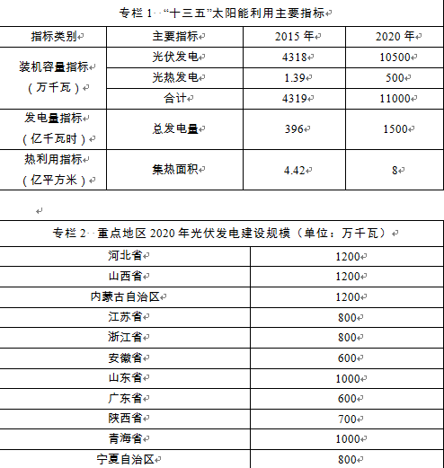 到2020年底,太陽能發(fā)電裝機(jī)達(dá)到1.1億千瓦以上,其中,光伏發(fā)電裝機(jī)達(dá)到1.05億千瓦以上,在“十二五”基礎(chǔ)上每年保持穩(wěn)定的發(fā)展規(guī)模;太陽能熱發(fā)電裝機(jī)達(dá)到500萬千瓦。太陽能熱利用集熱面積達(dá)到8億平方米。到2020年,太陽能年利用量達(dá)到1.4億噸標(biāo)準(zhǔn)煤以上。