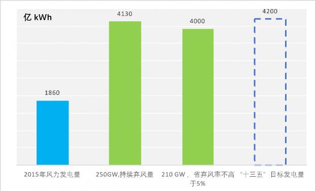 粗略的計(jì)算一下就能發(fā)現(xiàn),對(duì)于風(fēng)電部門而言,上述戰(zhàn)略并非如聽上去那么糟:2015年,中國(guó)風(fēng)電發(fā)電量為1860億千瓦時(shí),棄風(fēng)率15%。假設(shè)2020年風(fēng)電裝機(jī)擴(kuò)大為2.5億千瓦而各省份的風(fēng)電利用小時(shí)數(shù)保持不變,即棄風(fēng)率不增不減,則全年發(fā)電量為4100億千瓦時(shí)。規(guī)劃中新的裝機(jī)目標(biāo)為2.1億千瓦,同時(shí)要求各省將棄風(fēng)率降至5%以下,并增加“三北”地區(qū)以外棄風(fēng)率低的省份的風(fēng)電裝機(jī) 。假設(shè)這些目標(biāo)順利實(shí)現(xiàn),2.1億千瓦的裝機(jī)容量將生產(chǎn)4000億千瓦時(shí)的電量,相比2.5億千瓦裝機(jī)目標(biāo)的產(chǎn)量相差無(wú)幾,成本僅為其84%。相比而言,《風(fēng)電發(fā)展“十三五”規(guī)劃》要求2020年的風(fēng)電發(fā)電量達(dá)到4200億千瓦時(shí)(要想實(shí)現(xiàn)更高的產(chǎn)量,可以借助規(guī)劃中提到的擴(kuò)大渦輪機(jī)、發(fā)展海上風(fēng)電等措施。這些措施都將在現(xiàn)有風(fēng)電站的基礎(chǔ)上進(jìn)一步擴(kuò)大電力生產(chǎn)。)