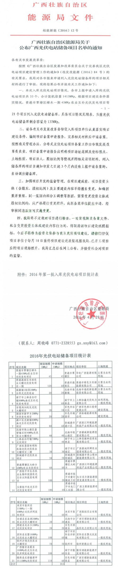 廣西能源局公布2016年光伏電站儲(chǔ)備項(xiàng)目名單