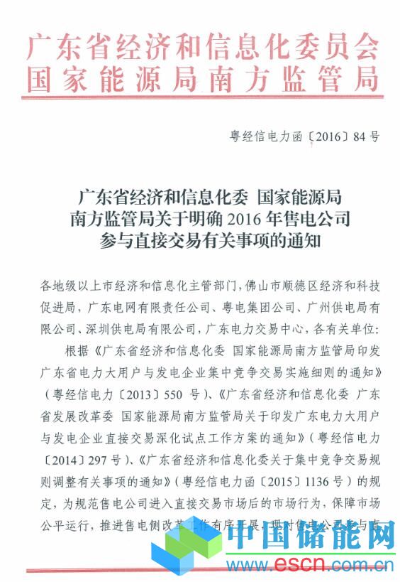中國儲能網(wǎng)訊:近日,廣東省經(jīng)濟和信息化委 國家能源局南方監(jiān)管局下發(fā)關(guān)于明確2016年售電公司參與直接交易有關(guān)事項的通知,通知全文如下: