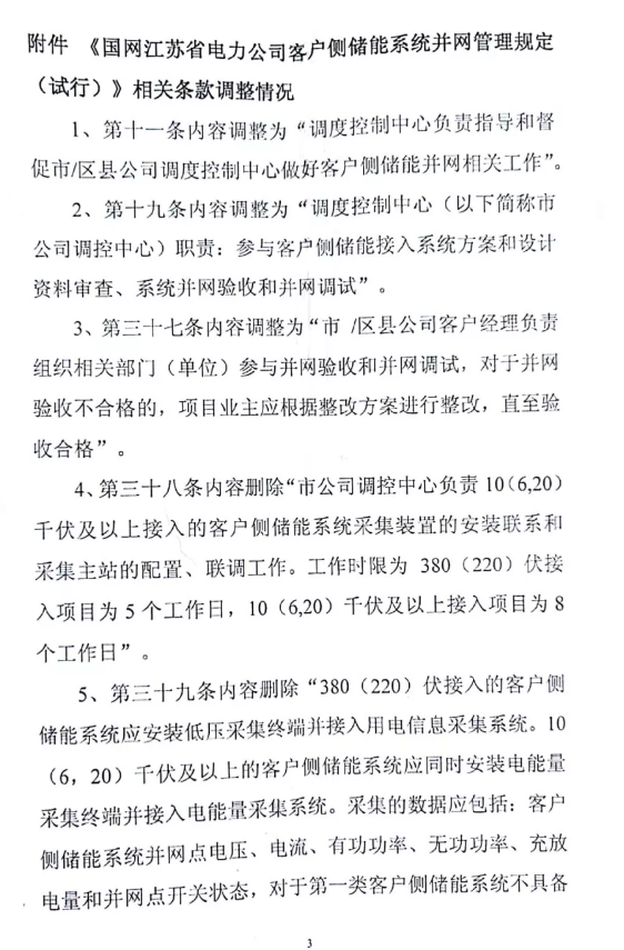 附件中對(duì)《客戶側(cè)儲(chǔ)能系統(tǒng)并網(wǎng)管理規(guī)定(試行)》部分條款調(diào)整,主要變更內(nèi)容為取消原來電壓等級(jí)的分類、變更了省市公司職責(zé)描述、以及變更簽訂協(xié)議的相關(guān)說明,詳細(xì)變更如下: