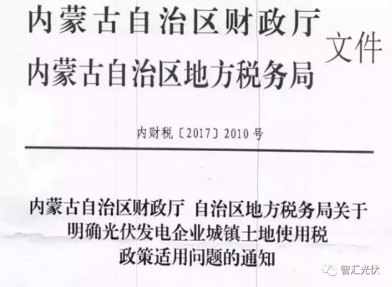 2017年12月,內(nèi)蒙古財政廳、地方稅務(wù)局聯(lián)合發(fā)布《關(guān)于明確光伏發(fā)電企業(yè)城鎮(zhèn)土地使用稅政策適用問題的通知》,文件提出: