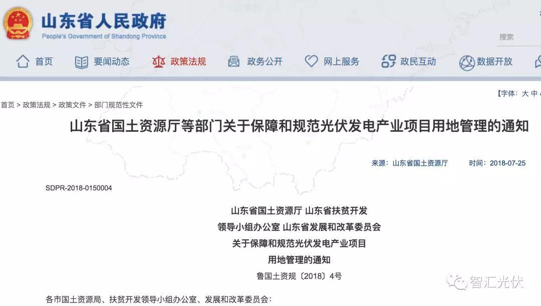 2018年7月25日,山東省國土廳、扶貧開發(fā)領(lǐng)導(dǎo)小組辦公室 、發(fā)改委聯(lián)合發(fā)布《關(guān)于保障和規(guī)范光伏發(fā)電產(chǎn)業(yè)項目用地管理的通知》(魯國土資規(guī)〔2018〕4號),文件提出