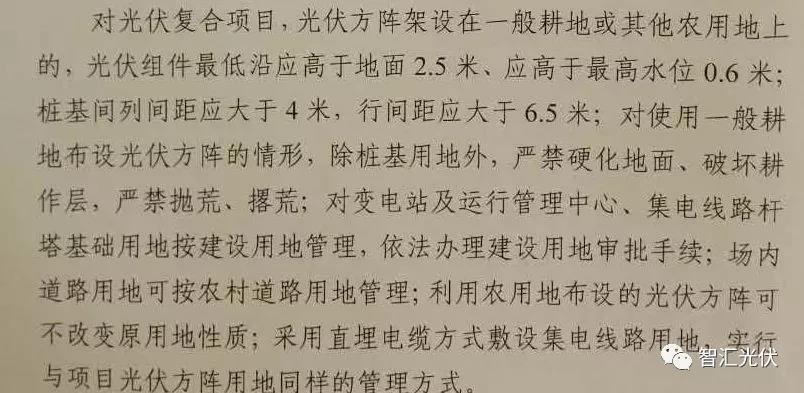 對光伏復(fù)合項目,光伏方陣架設(shè)在一般耕地或其他農(nóng)用地上的,光伏組件最低沿應(yīng)高于地面2.5米,應(yīng)高于最低水位0.6米;樁基間列間距大于4米,行間距應(yīng)大于6.5米”