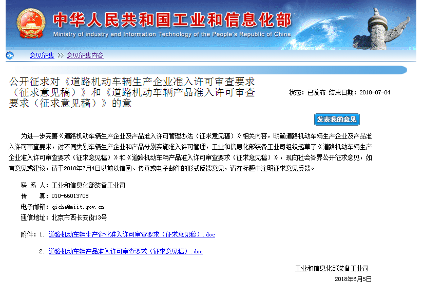 為進(jìn)一步完善《道路機(jī)動(dòng)車輛生產(chǎn)企業(yè)及產(chǎn)品準(zhǔn)入許可管理辦法(征求意見稿)》相關(guān)內(nèi)容,明確道路機(jī)動(dòng)車輛生產(chǎn)企業(yè)及產(chǎn)品準(zhǔn)入許可審查要求,對(duì)不同類別車輛生產(chǎn)企業(yè)和產(chǎn)品分別實(shí)施準(zhǔn)入許可管理,工業(yè)和信息化部裝備工業(yè)司組織起草了《道路機(jī)動(dòng)車輛生產(chǎn)企業(yè)準(zhǔn)入許可審查要求(征求意見稿)》和《道路機(jī)動(dòng)車輛產(chǎn)品準(zhǔn)入許可審查要求(征求意見稿)》,現(xiàn)向社會(huì)各界公開征求意見,如有意見或建議,請(qǐng)于2018年7月4日以前以信函、傳真或電子郵件的形式反饋意見,請(qǐng)?jiān)跇?biāo)題中注明征求意見反饋。