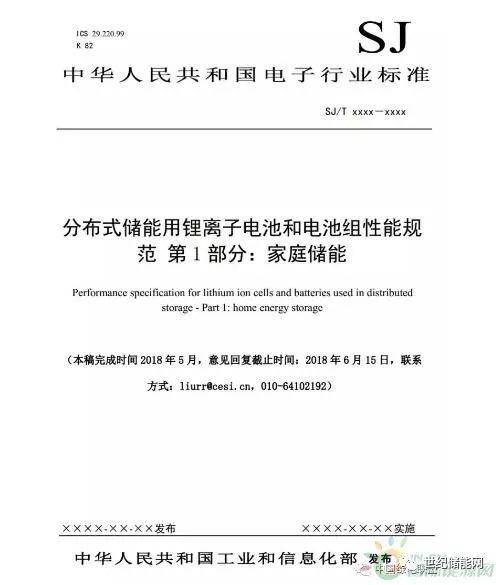 根據(jù)工業(yè)和信息化部下達的行業(yè)標(biāo)準(zhǔn)編制計劃,家庭儲能用鋰電池標(biāo)準(zhǔn)起草組完成了電子行業(yè)標(biāo)準(zhǔn)SJ/T XXXXX《分布式儲能用鋰離子電池和電池組性能規(guī)范 第1部分:家庭儲能》(2018-0140T-SJ)征求意見一稿的編制工作。為保證項目的進度和質(zhì)量,現(xiàn)向各相關(guān)單位征求意見,請于2018年06月15日前將意見反饋至liurr@cesi.cn。工作組秘書處計劃于2018年6月下旬組織召開標(biāo)準(zhǔn)征求意見稿討論會,具體時間另行通知。