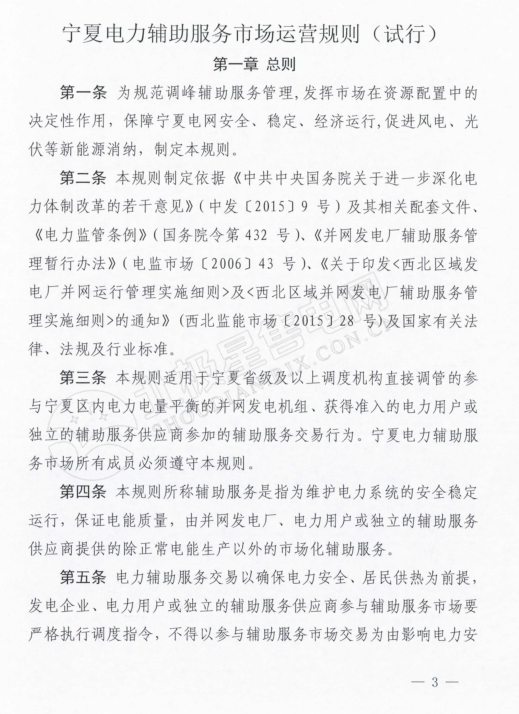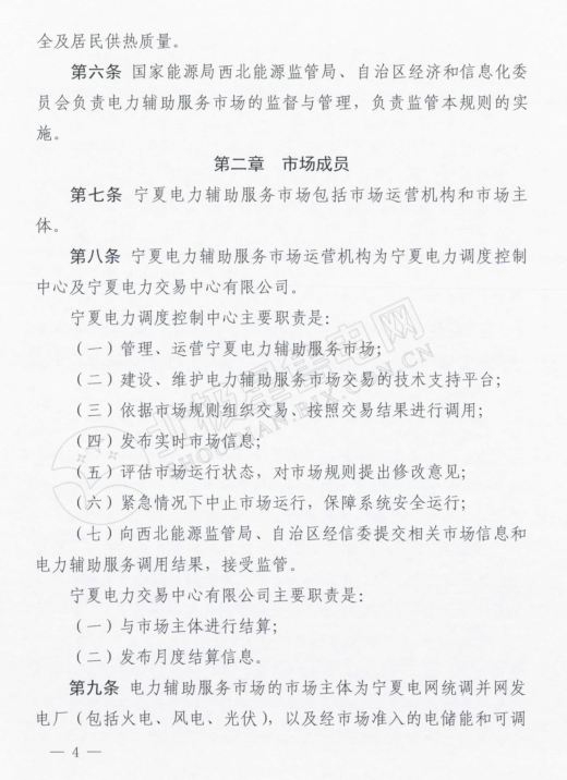 在《寧夏電力輔助服務(wù)市場運營規(guī)則》中,規(guī)定電力輔助服務(wù)市場的市場主體為寧夏電網(wǎng)統(tǒng)調(diào)并網(wǎng)發(fā)電廠(火電、風(fēng)電、光伏),以及經(jīng)市場準(zhǔn)入的電儲能和可調(diào)節(jié)負(fù)荷電力用戶。新建機(jī)級組滿負(fù)荷試運結(jié)束后即納入輔助服務(wù)管理范圍,火電機(jī)組參與范圍為單機(jī)容量100MW及以上的燃煤發(fā)電機(jī)組。與前不久剛剛發(fā)布的甘肅的電力輔助服務(wù)運營規(guī)則中規(guī)定的市場主體相比較,缺少了水電企業(yè)的身影。