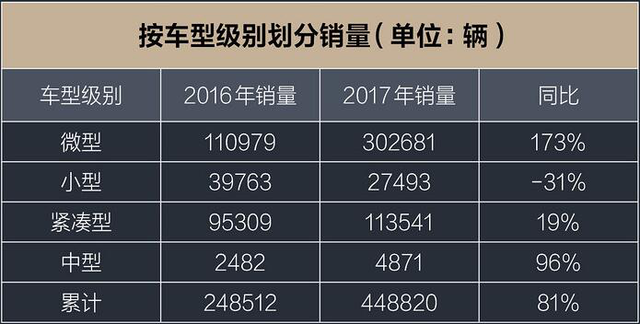 根據(jù)2017年純電新能源車的銷量來看,2017年純電乘用車累計銷量448820輛,相比2016年總體增長了81%,這其中,微型電動車累計銷量為30.2萬元,占比純電動乘用車總銷量的67.4%,同比2016年增長173%。