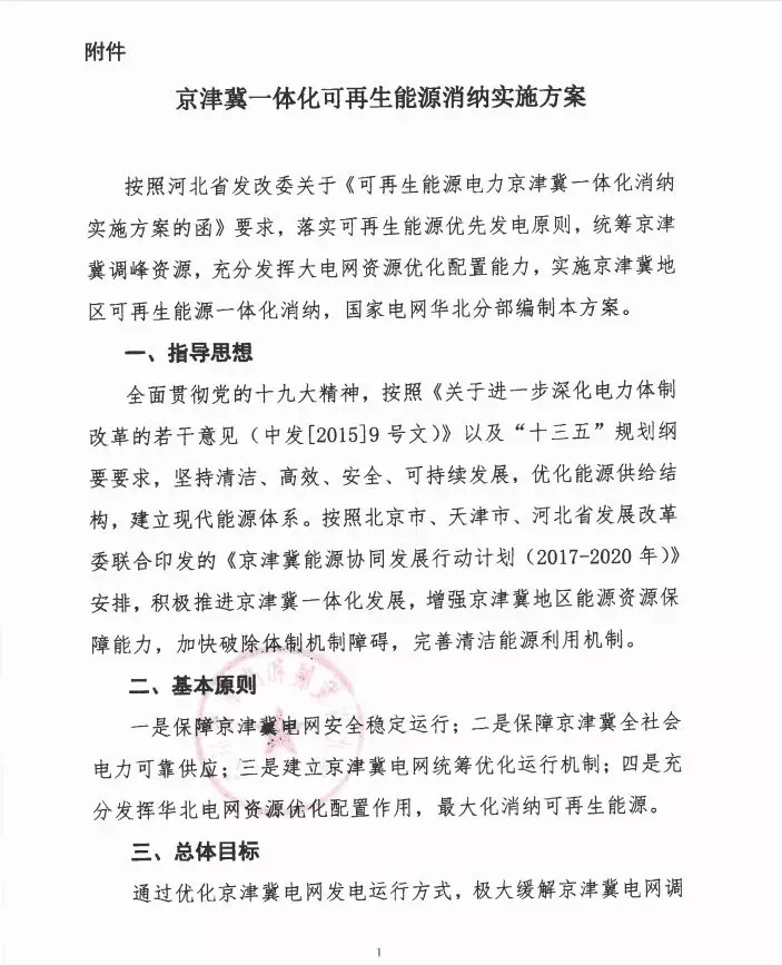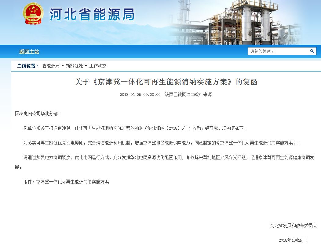 為貫徹落實《京津冀協(xié)同發(fā)展規(guī)劃綱要》,在2017年11月15日的采暖季開始之前,北京、天津和河北三地發(fā)改委就聯(lián)合印發(fā)了《京津冀能源協(xié)同發(fā)展行動計劃(2017-2020年)》(以下簡稱行動計劃)。行動計劃提出,未來將推進(jìn)可再生能源發(fā)展,大力發(fā)展風(fēng)電、光電,推進(jìn)風(fēng)電基地建設(shè)。打造張家口可再生能源示范區(qū),建設(shè)崇禮低碳奧運(yùn)專區(qū)。規(guī)劃建設(shè)能源高端應(yīng)用示范區(qū),鼓勵多能互補(bǔ)、智能融合的能源利用新模式。此外,還將促進(jìn)可再生能源消納,優(yōu)先安排張家口可再生能源示范區(qū)等可再生能源和清潔能源上網(wǎng),實現(xiàn)在京津冀區(qū)域一體化消納。
