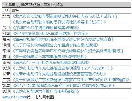 中國儲能網(wǎng)訊:2018年1月,國務院、科技部、發(fā)改委等部門出臺了新能源汽車相關政策。北京、深圳、濟南、海南、漳州、平潭、唐山、南京、長沙、廣東、如皋、長春等12省市出臺新能源汽車相關政策。其中北京出臺了國內(nèi)首個自動駕駛車輛封閉測試場地技術要求和車輛測試能力評估內(nèi)容與方法。廣東和長沙出臺了2018年新能源汽車補貼政策。平潭、長沙、唐山、南京和長春出臺了充電基礎設施政策。