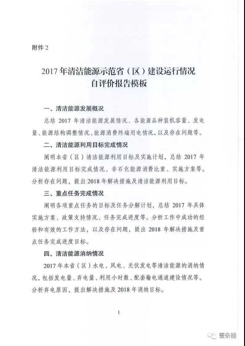 四、開展2017年清潔能源示范省(區(qū))評價工作。各有關(guān)?。▍^(qū))能源主管部門在2018年3月1日前提交2017年建設(shè)運行情況自評價報告。2017年清潔能源示范?。▍^(qū))建設(shè)運行情況自評價報告模板見附件2。