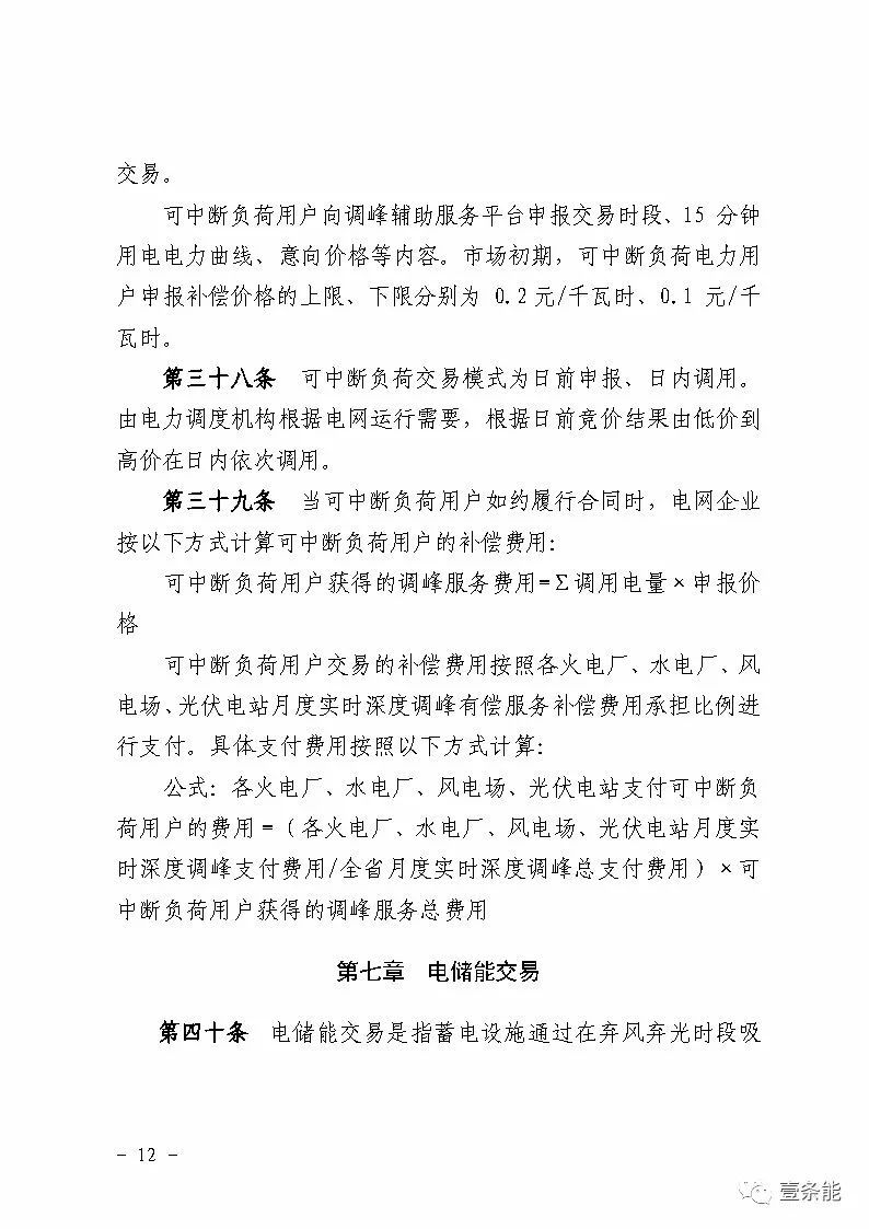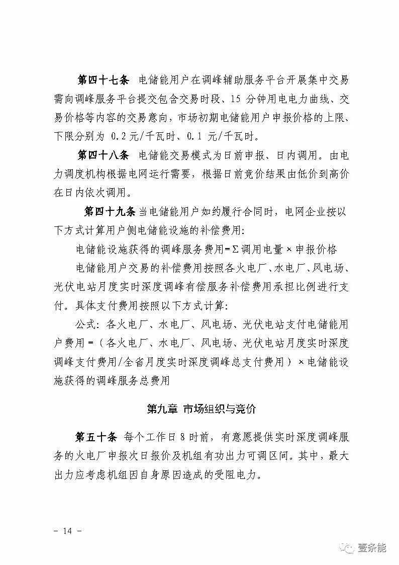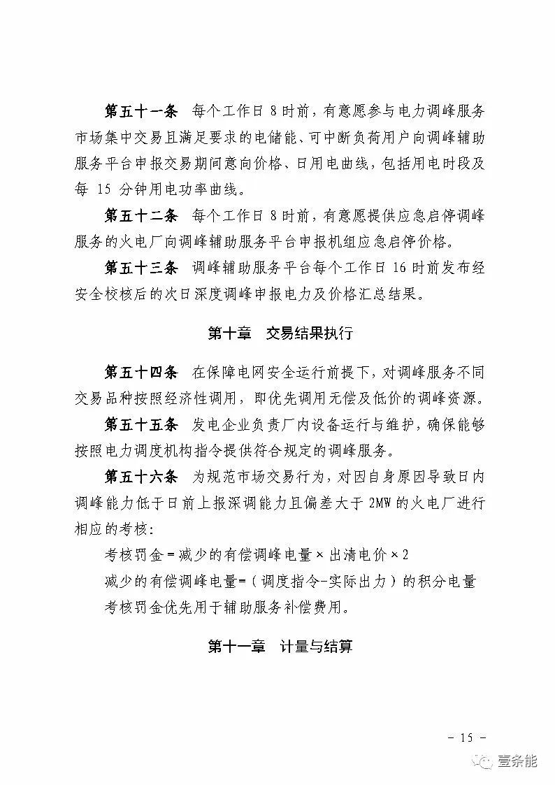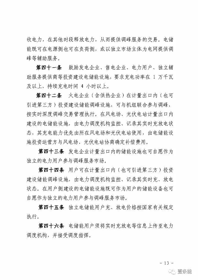 火電企業(yè)在計量出口內(nèi)投資建設(shè)儲能調(diào)峰設(shè)施,可與機組聯(lián)合參與調(diào)峰,按實時深度調(diào)峰交易管理執(zhí)行。在風(fēng)電場、光伏電站計量出口內(nèi)建設(shè)的電儲能設(shè)施,由電力調(diào)度機構(gòu)監(jiān)控、記錄其實時充放電狀態(tài),其充電能力優(yōu)先由所在風(fēng)電場和光伏電站使用,由電儲能設(shè)施投資運營方與風(fēng)電場、光伏電站協(xié)商確定補償費用。