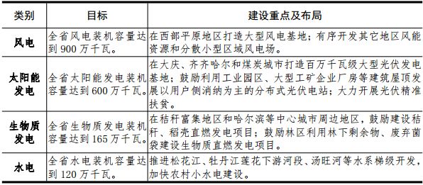 3.積極發(fā)展可再生能源風(fēng)電。風(fēng)力發(fā)電重點(diǎn)布局向我省西部地區(qū)轉(zhuǎn)移,利用西部地區(qū)鹽堿地、沙化地等未利用地豐富優(yōu)勢和電力消納能力較強(qiáng)優(yōu)勢,優(yōu)先開發(fā)、集中打造大型風(fēng)電基地。在加強(qiáng)生態(tài)保護(hù)前提下,有序開發(fā)東部等其他地區(qū)風(fēng)力資源。因地制宜提高風(fēng)能利用效率,積極開展分散式風(fēng)電試點(diǎn)示范。到2020年,全省風(fēng)電裝機(jī)容量達(dá)到900萬千瓦。太陽能發(fā)電。大型太陽能電站重點(diǎn)布局在我省中西部鹽堿地等未利用土地和東部四煤城采煤沉陷區(qū),集中打造齊齊哈爾、大慶、綏化和東部四煤城大型光伏發(fā)電基地;大力推進(jìn)光伏精準(zhǔn)扶貧,在重點(diǎn)貧困地區(qū)推進(jìn)建設(shè)一批村級光伏扶貧電站;鼓勵(lì)利用大型公共建筑及公用設(shè)施、工業(yè)園區(qū)等屋頂建設(shè)分布式光伏發(fā)電。到2020年,全省太陽能發(fā)電容量達(dá)到600萬千瓦。生物質(zhì)能發(fā)電。統(tǒng)籌規(guī)劃、合理布局生物質(zhì)發(fā)電項(xiàng)目。在哈爾濱、齊齊哈爾、佳木斯、大慶等中心城市周邊地區(qū),雞西、雙鴨山、鶴崗、綏化、撫遠(yuǎn)及農(nóng)墾等糧食主產(chǎn)區(qū),規(guī)劃布局一批以秸稈和糧食加工剩余物為原料的生物質(zhì)直燃發(fā)電項(xiàng)目;在牡丹江、黑河、伊春等林區(qū),建設(shè)一批以林下剩余物、廢棄菌袋等為主的生物質(zhì)直燃發(fā)電項(xiàng)目。加快燃煤與生物質(zhì)耦合發(fā)電關(guān)鍵技術(shù)研發(fā),選擇有條件的燃煤電廠進(jìn)行秸稈摻燒改造試點(diǎn),降低電廠煤耗,減少生物質(zhì)直接焚燒污染。開展生物質(zhì)氣化發(fā)電、沼氣發(fā)電試點(diǎn)示范。到2020年,全省生物質(zhì)發(fā)電裝機(jī)容量達(dá)到165萬千瓦,年消耗各類生物質(zhì)資源1300萬噸。水電。在做好生態(tài)環(huán)境保護(hù)和移民安置的前提下,以內(nèi)河資源為主,按照流域規(guī)劃,兼顧經(jīng)濟(jì)和社會(huì)效益,堅(jiān)持梯級、有序、滾動(dòng)開發(fā),重點(diǎn)加快牡丹江干流蓮花水電站以下江段、湯旺河干流、海浪河干流等流域水電開發(fā)建設(shè)。加快推進(jìn)荒溝抽水蓄能電站建設(shè),開工建設(shè)尚志、五常抽水蓄能電站,完成依蘭抽水蓄能電站前期工作,提前開展其它優(yōu)質(zhì)站址資源的前期工作。到2020年,全省常規(guī)水電裝機(jī)達(dá)到120萬千瓦。
