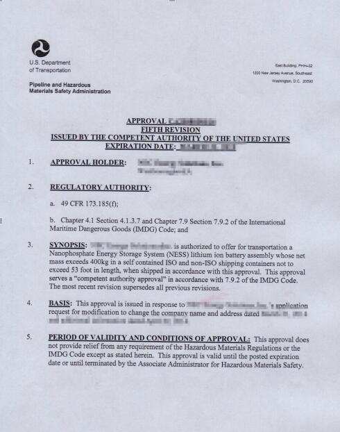 目前在美國運輸此類產(chǎn)品之前,都必須獲得美國交通部(DOT)PHMSA的特別批準文件后才能進行公路,鐵路和海洋運輸。然而能夠通過并且獲得DOT的審批,需要提交復(fù)雜的文件和漫長的等待,而最終獲得過特別批準的也僅為極少數(shù)的美國知名制造商。