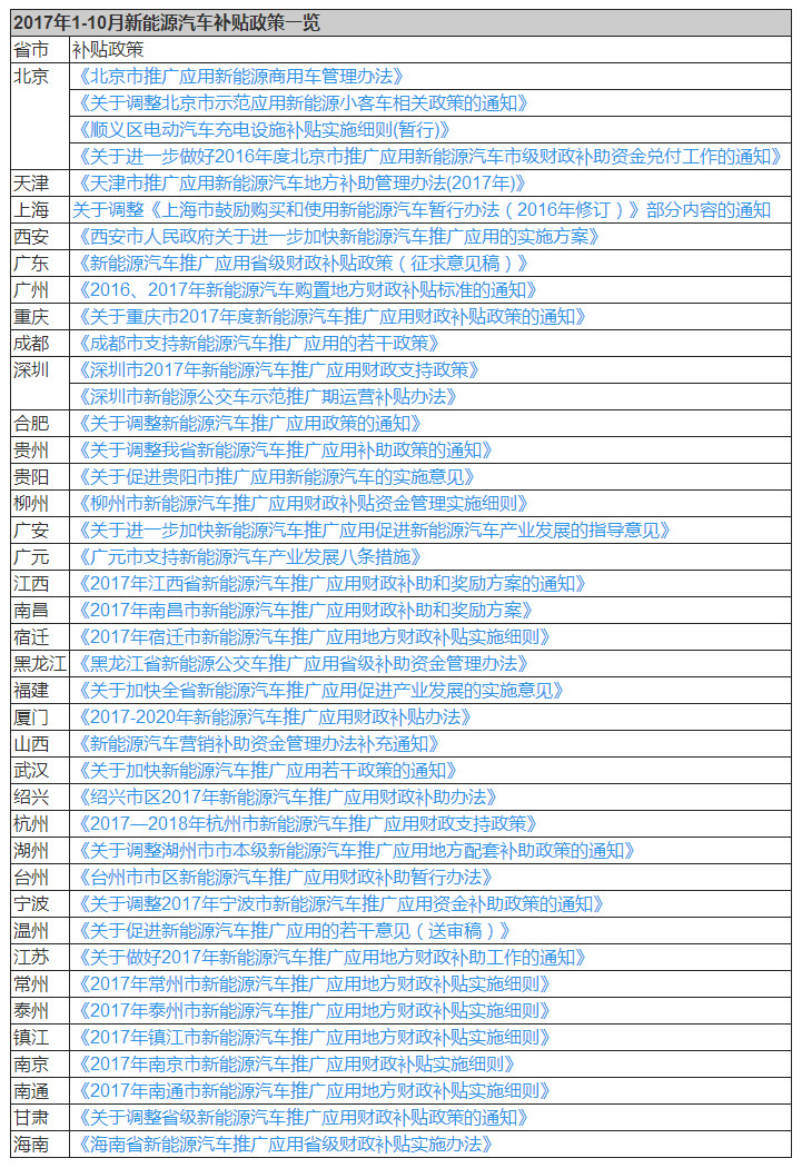 2017年7月,北京、深圳、廣州、重慶、成都、貴陽、貴州、柳州、廣元、廣安、江西、宿遷、廈門13個省市出臺了2017新能源汽車補貼政策。
