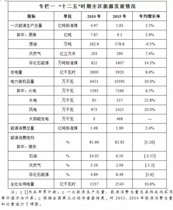 能源結(jié)構(gòu)不斷優(yōu)化?!笆濉逼陂g,全區(qū)能源結(jié)構(gòu)由傳統(tǒng)化石能源為主逐步向化石能源和非化石能源并重轉(zhuǎn)變,能源發(fā)展呈現(xiàn)出多元化、低碳化的特征。天然氣和非化石能源在一次能源生產(chǎn)總量中的比重分別提高至2015年的6.9%和2.9%,較2010年分別提高1.5個和1.2個百分點(diǎn);煤炭在一次能源生產(chǎn)總量中的比重降低至2015年的90%以下,較2010年下降2.6個百分點(diǎn);非化石能源裝機(jī)比重由2010年的16.4%提高至30.1%;非化石能源消費(fèi)比重提高至8.5%,“十二五”期間累計(jì)提高3.6個百分點(diǎn)。