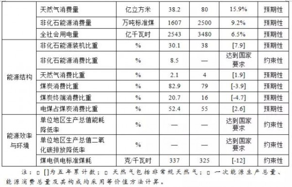 ——能源結(jié)構(gòu)。進(jìn)一步提高非化石能源裝機(jī)和消費(fèi)比重,非化石能源裝機(jī)比重達(dá)到38%左右,非化石能源消費(fèi)比重達(dá)到國家要求。天然氣消費(fèi)比重提高到4%左右,煤炭消費(fèi)比重降低到79%左右。煤炭終端消費(fèi)比重下降到16%左右,電煤占煤炭消費(fèi)比重提高到55%左右。