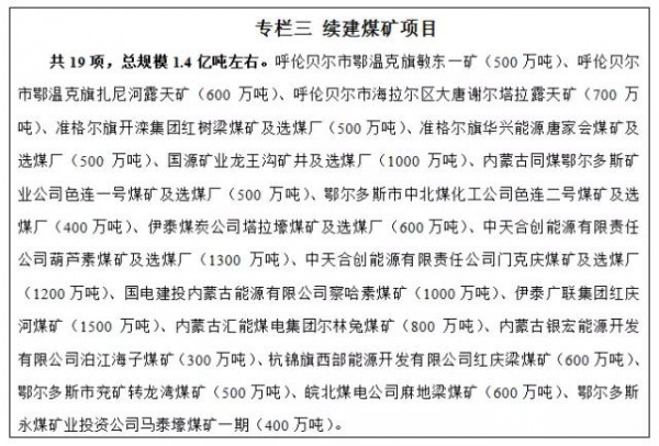 穩(wěn)步推進(jìn)煤炭生產(chǎn)基地建設(shè)。統(tǒng)籌安排煤炭總量和布局,依托勝利、五間房、白音華、準(zhǔn)格爾、東勝、上海廟、伊敏、寶日希勒等大型整裝煤田,按照國家總體能源戰(zhàn)略部署,重點(diǎn)圍繞保障煤電、現(xiàn)代煤化工等主要耗煤項(xiàng)目用煤需求,推動鄂爾多斯、錫林郭勒、呼倫貝爾三大煤炭生產(chǎn)基地建設(shè),力爭到2020年原煤產(chǎn)量控制在11.5億噸左右?!笆濉逼陂g,建成投產(chǎn)煤礦項(xiàng)目35項(xiàng),總規(guī)模2.5億噸左右。續(xù)建煤礦項(xiàng)目19項(xiàng),總規(guī)模1.4億噸左右,其中鄂爾多斯1.2億噸、呼倫貝爾2000萬噸左右。圍繞煤電和煤化工基地配套用煤項(xiàng)目,擬新開工并建成煤礦項(xiàng)目16項(xiàng),總規(guī)模1.2億噸左右,其中鄂爾多斯新增產(chǎn)能6500萬噸、錫林郭勒新增產(chǎn)能4500萬噸、通遼新增產(chǎn)能600萬噸左右。