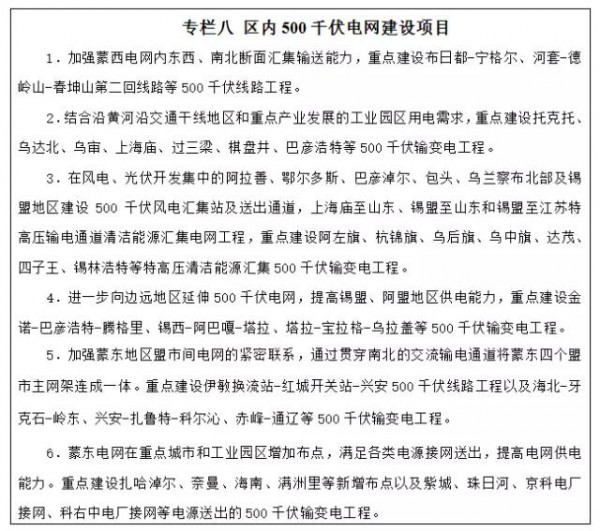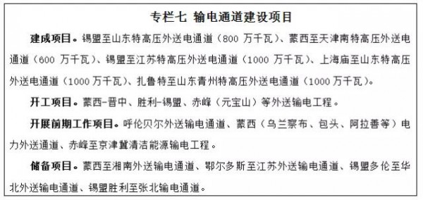 結(jié)合全國電力供需整體形勢、電源基地開發(fā)進(jìn)度等因素,堅(jiān)持適度超前的原則,采用大容量、遠(yuǎn)距離、高效率的特高壓先進(jìn)輸電技術(shù),加快電力外送通道及配套接網(wǎng)工程建設(shè),進(jìn)一步提高電力外送規(guī)模?!笆濉逼陂g,建成錫盟-山東、錫盟-江蘇、上海廟-山東、蒙西-天津南、扎魯特-山東青州等特高壓外送電通道。爭取開工建設(shè)蒙西-晉中、勝利-錫盟、赤峰(元寶山)等外送輸電工程。結(jié)合受端市場情況,積極推進(jìn)呼倫貝爾、蒙西(烏蘭察布、包頭、阿拉善等)、赤峰-京津冀等電力外送通道論證。力爭到2020年電力外送形成“兩交三直”特高壓、多條超高壓外送通道格局。