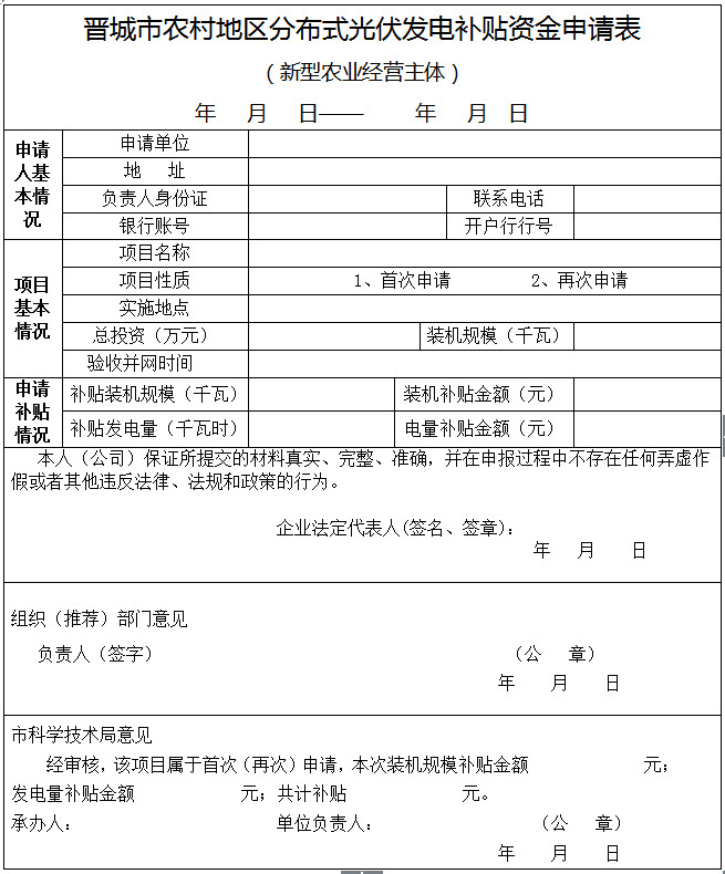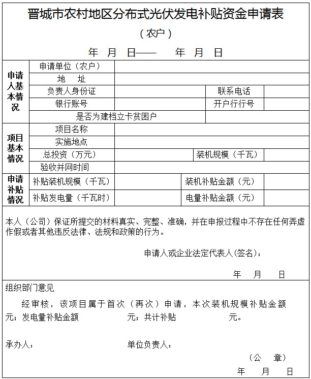 1、《晉城市農(nóng)村地區(qū)分布式光伏發(fā)電補(bǔ)貼資金申請表》。