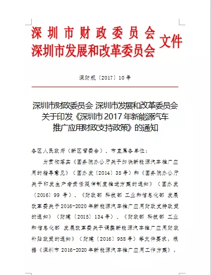 為貫徹落實(shí)《國務(wù)院辦公廳關(guān)于加快新能源汽車推廣應(yīng)用的指導(dǎo)意見》(國辦發(fā)〔2014〕35號)、《財(cái)政部 科技部 工業(yè)和信息化部 發(fā)展改革委關(guān)于2016-2020年新能源汽車推廣應(yīng)用財(cái)政支持政策的通知》(財(cái)建〔2015〕134號)和《財(cái)政部 科技部 工業(yè)和信息化部 發(fā)展改革委關(guān)于調(diào)整新能源汽車推廣應(yīng)用財(cái)政補(bǔ)貼政策的通知》(財(cái)建〔2016〕958號)等文件精神,現(xiàn)制定深圳市2017年新能源汽車推廣應(yīng)用財(cái)政支持政策如下: